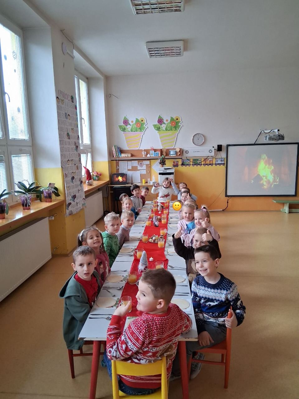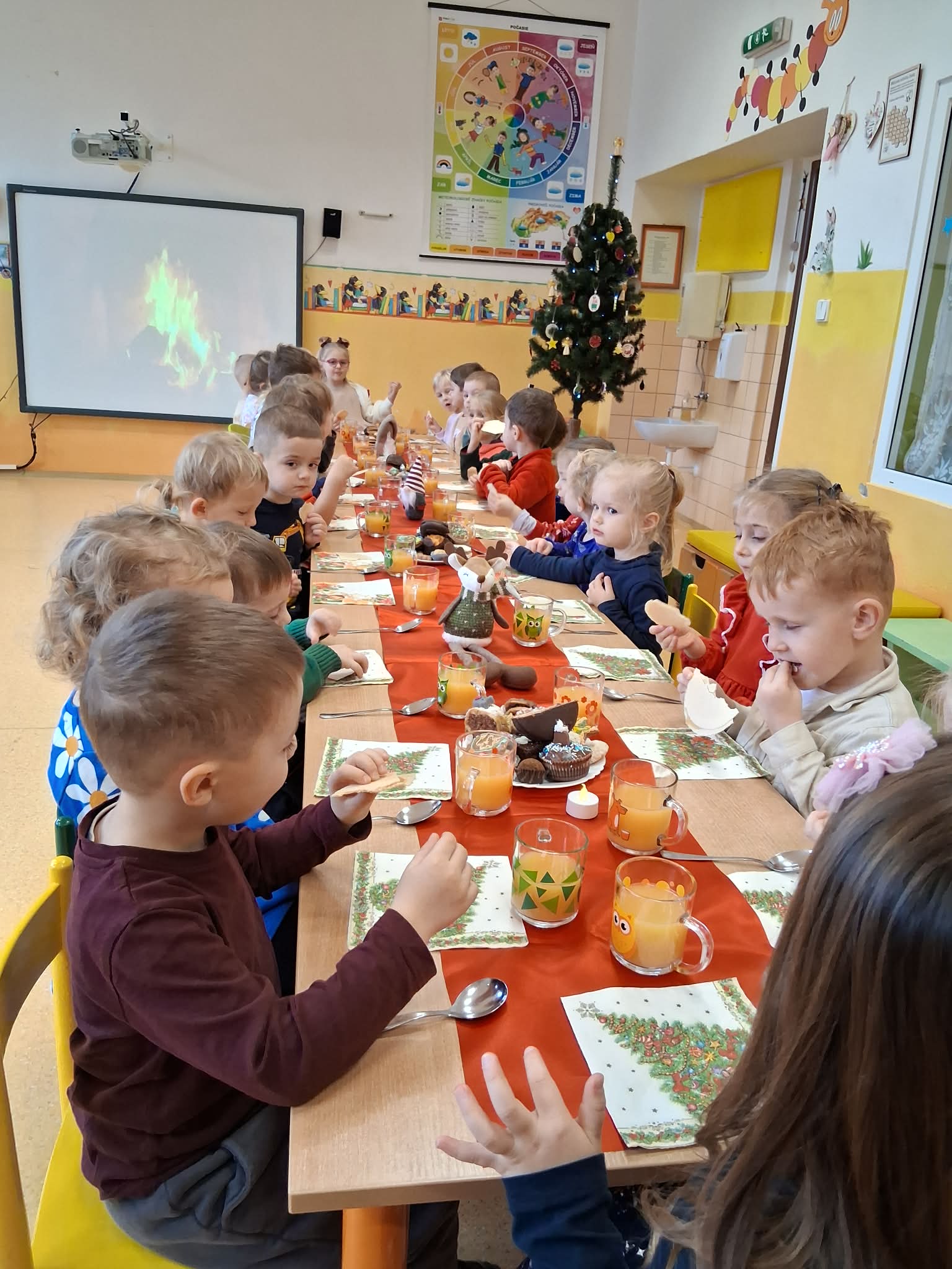 Deti a zamestnanci materskej školy si spoločne vychutnali slávnostný vianočný obed, ktorý vytvoril príjemnú a sviatočnú atmosféru. Pri obede sa deti tešili zo spoločného stolovania, rozprávania a radosti z Vianoc, čo podporilo pocit spolupatričnosti, tradícií a priateľskej atmosféry v triede. Ďakujeme rodičom za pomoc so zabezpečením koláčikov.