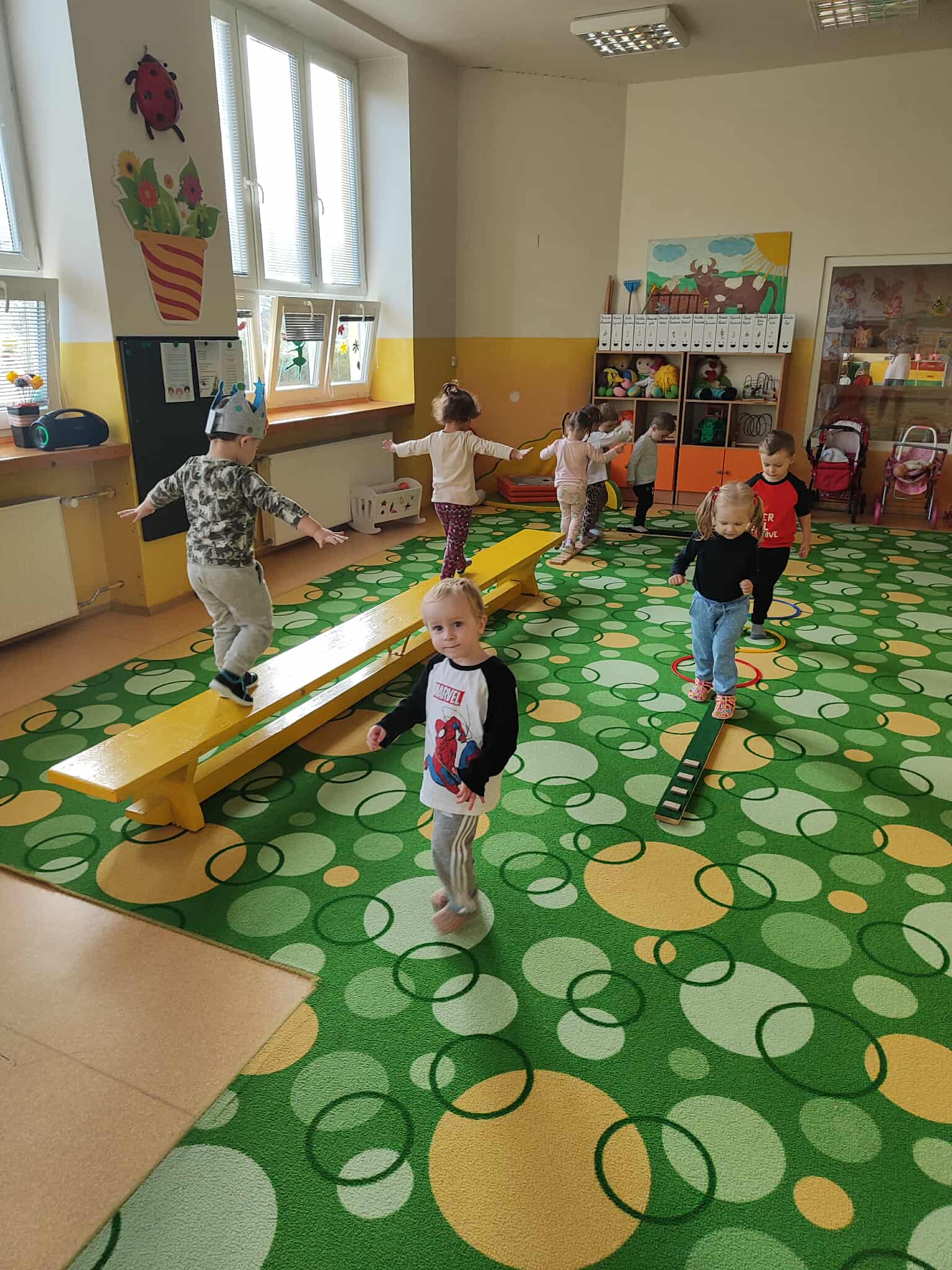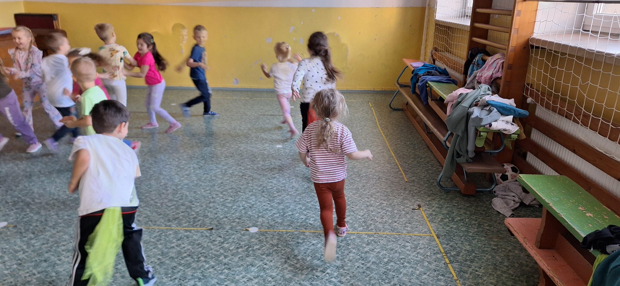 Deti sa v telocvični zapájajú do rôznych pohybových hier a aktivít, ktoré rozvíjajú ich obratnosť, rovnováhu a koordináciu.
