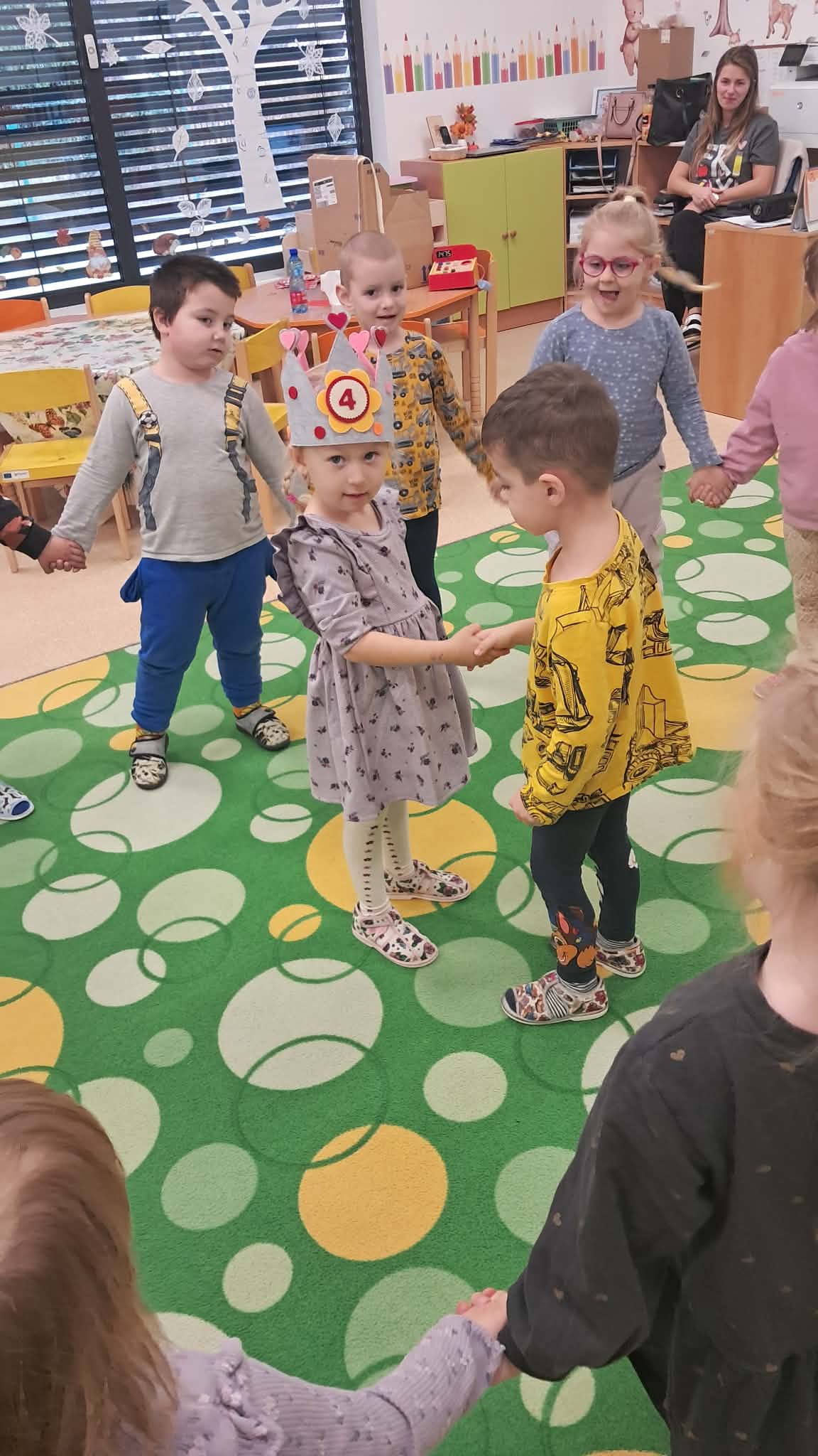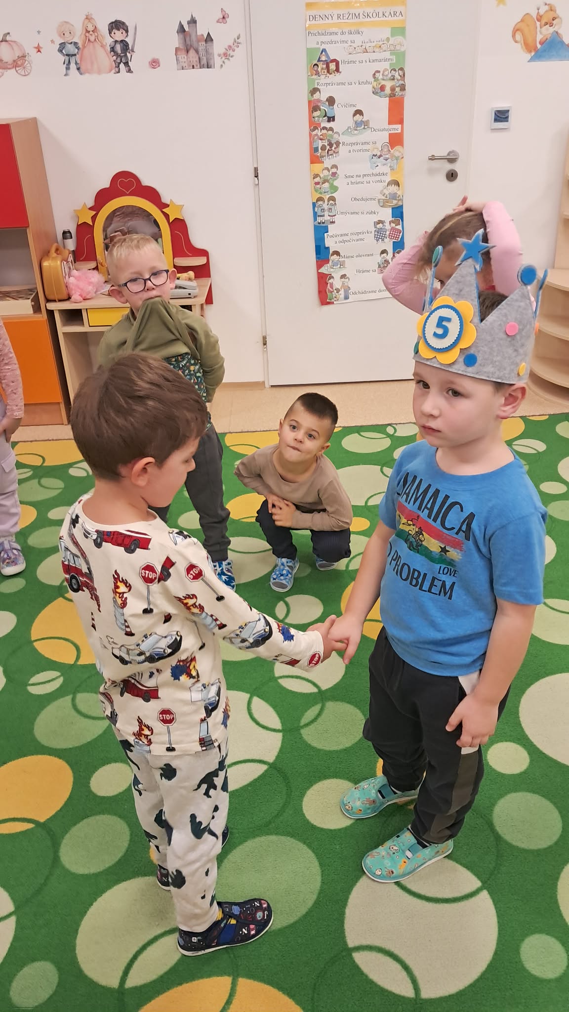 V materskej škole deti vždy oslávia narodeniny alebo meniny svojich kamarátov. Spoločne gratulujú, zaspievajú, popripomínajú príjemné chvíle a oslávencovi venujú pozornosť a objatie.