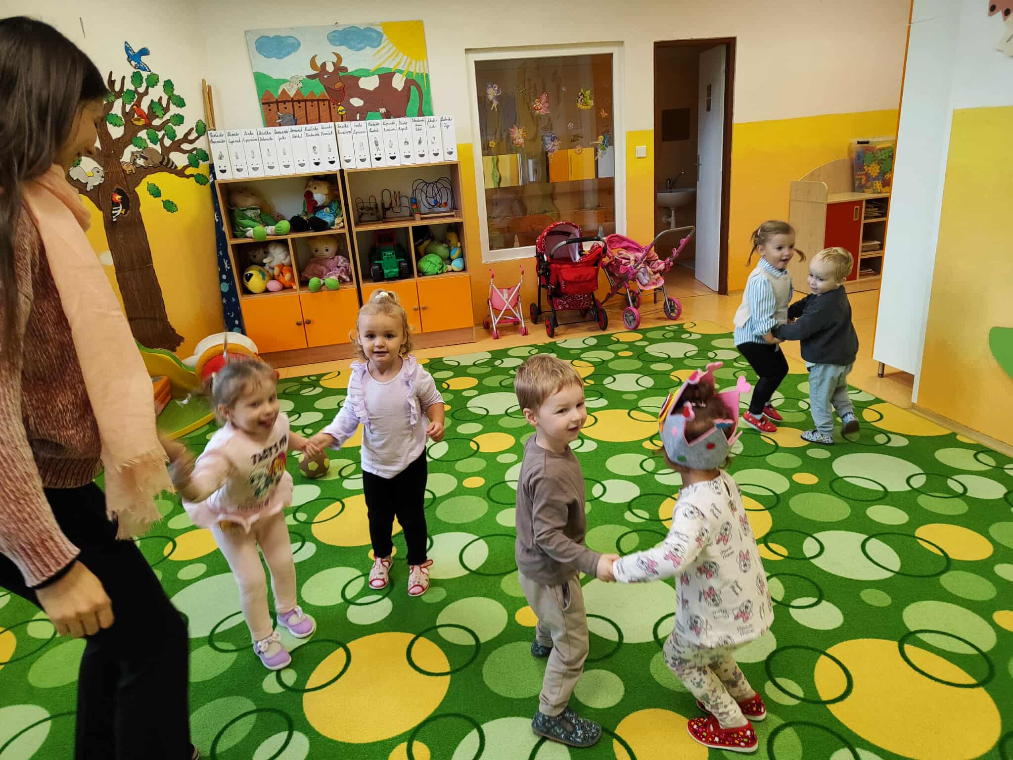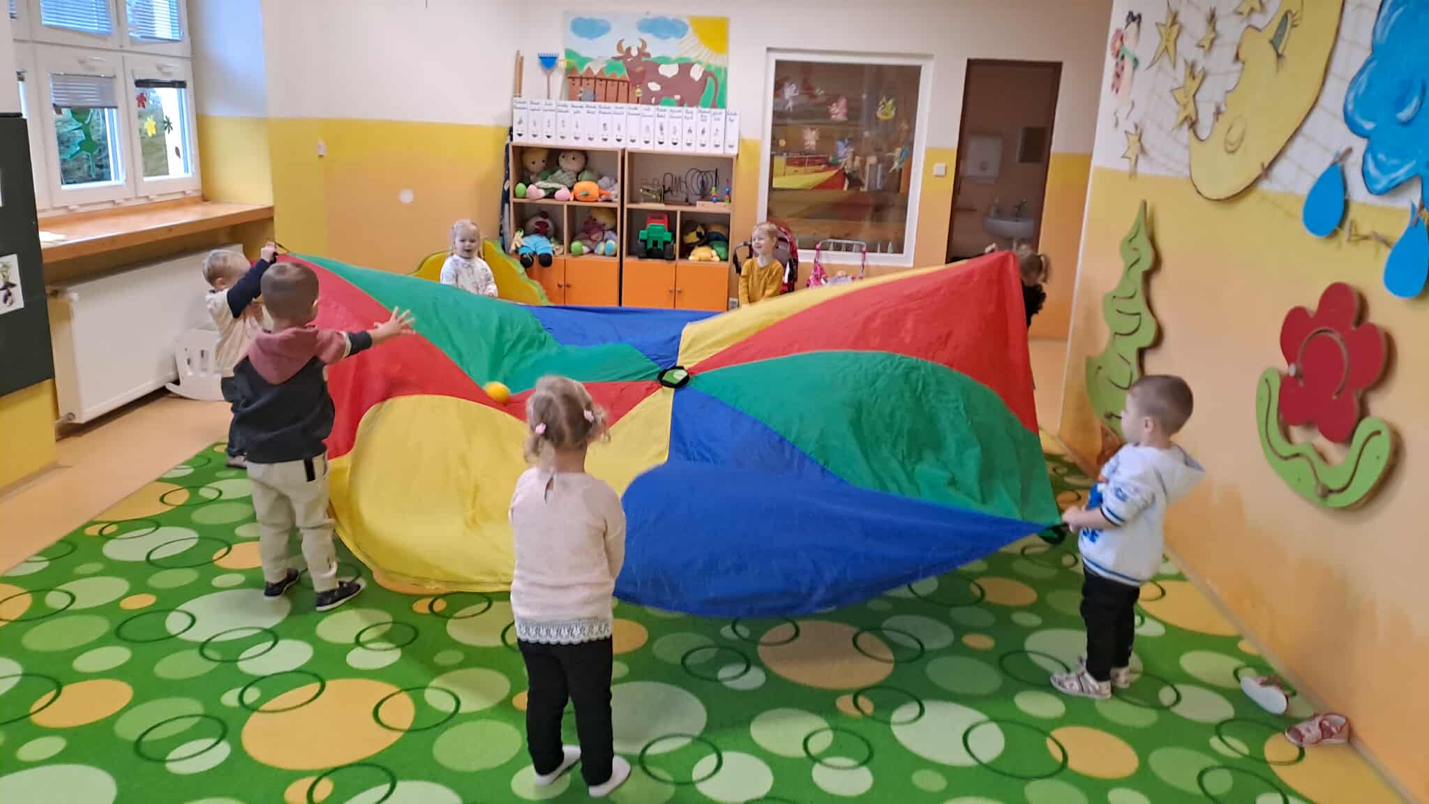 Najmenšie deti si užili veselé cvičenie plné pohybu a smiechu. Spoločne sa zapojili do hier s farebným padákom, ktorý ich nadchol svojimi pestrými farbami a možnosťou tímovej spolupráce. Veľkú radosť mali aj z prehliadania tunela, kde sa plazili a schovávali. Tieto aktivity rozvíjali ich obratnosť, odvahu a spoluprácu v skupine – a pritom si užili veľa zábavy!