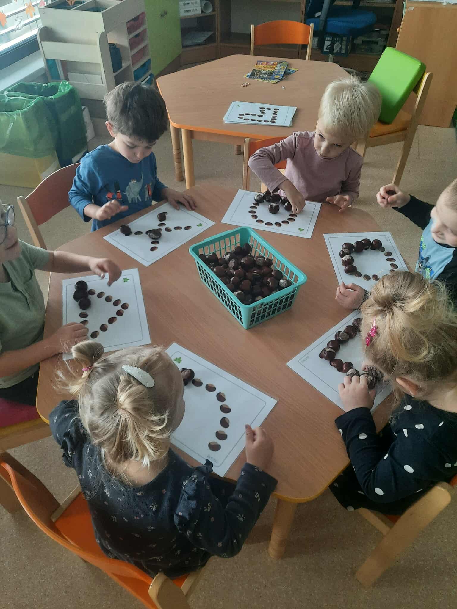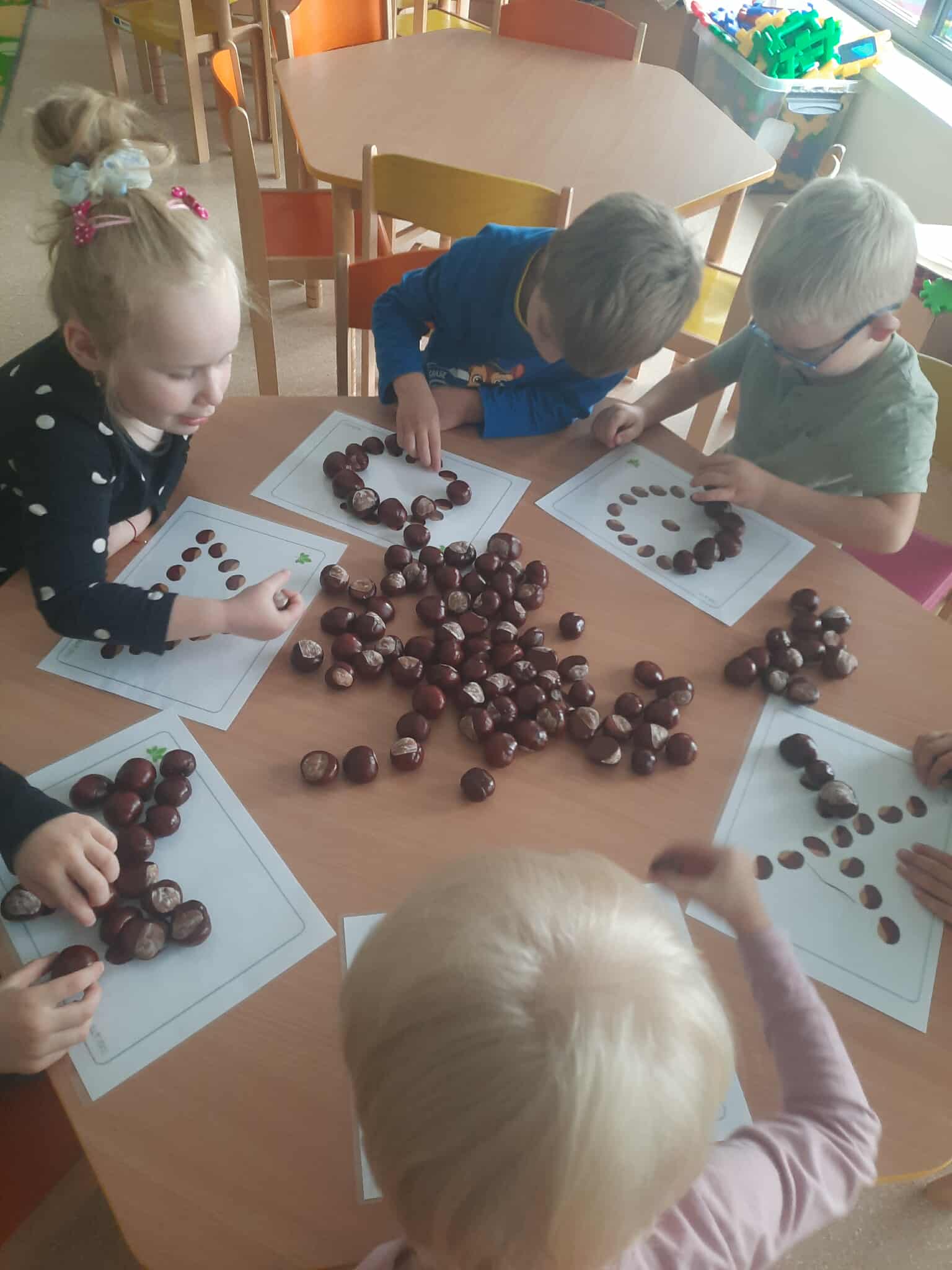 Deti si s príchodom jesene užili tvorivé aktivity s gaštanmi, z ktorých skladali postavičky, zvieratká a rôzne obrazce. Gaštany tiež ukladali na podložky podľa tvaru či vzoru, čím rozvíjali svoju predstavivosť, trpezlivosť a jemnú motoriku.