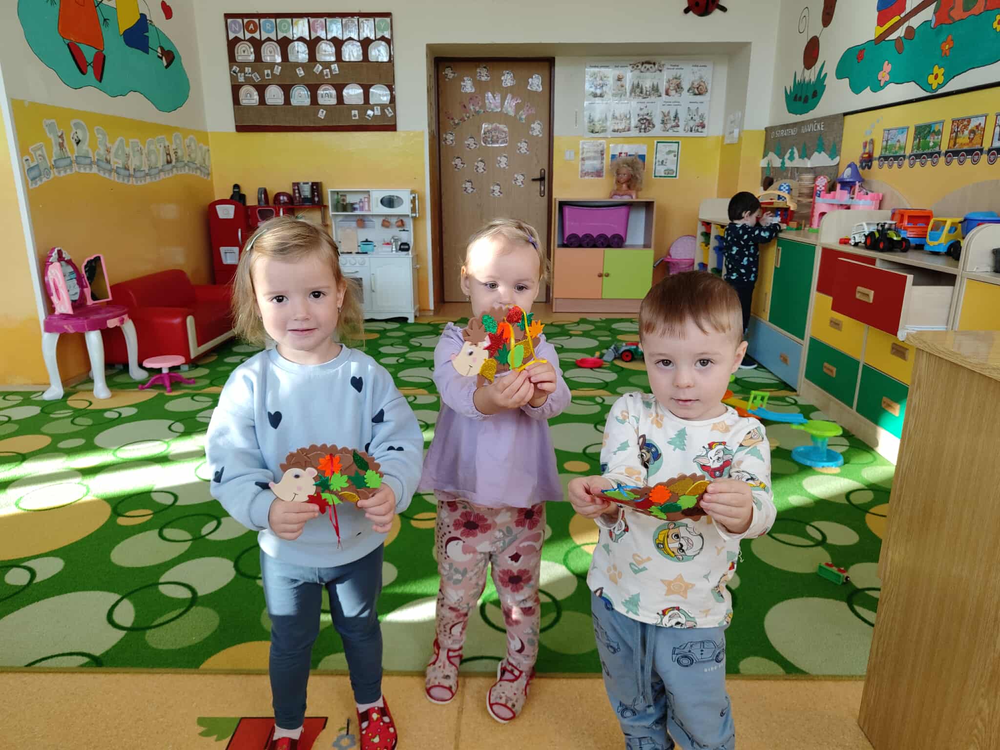 Deti si s príchodom jesene užili tvorivé aktivity s gaštanmi, z ktorých skladali postavičky, zvieratká a rôzne obrazce. Gaštany tiež ukladali na podložky podľa tvaru či vzoru, čím rozvíjali svoju predstavivosť, trpezlivosť a jemnú motoriku. Deti si s nadšením vyskúšali prípravu jablkového koláča. Spoločne strúhali jabĺčka, miešali cesto a pozorovali, ako sa všetky suroviny menia na chutný dezert. Pri pečení si deti precvičili trpezlivosť, spoluprácu aj základné pracovné návyky. A najlepšou odmenou bola vôňa čerstvo upečeného koláča a jeho sladká ochutnávka.