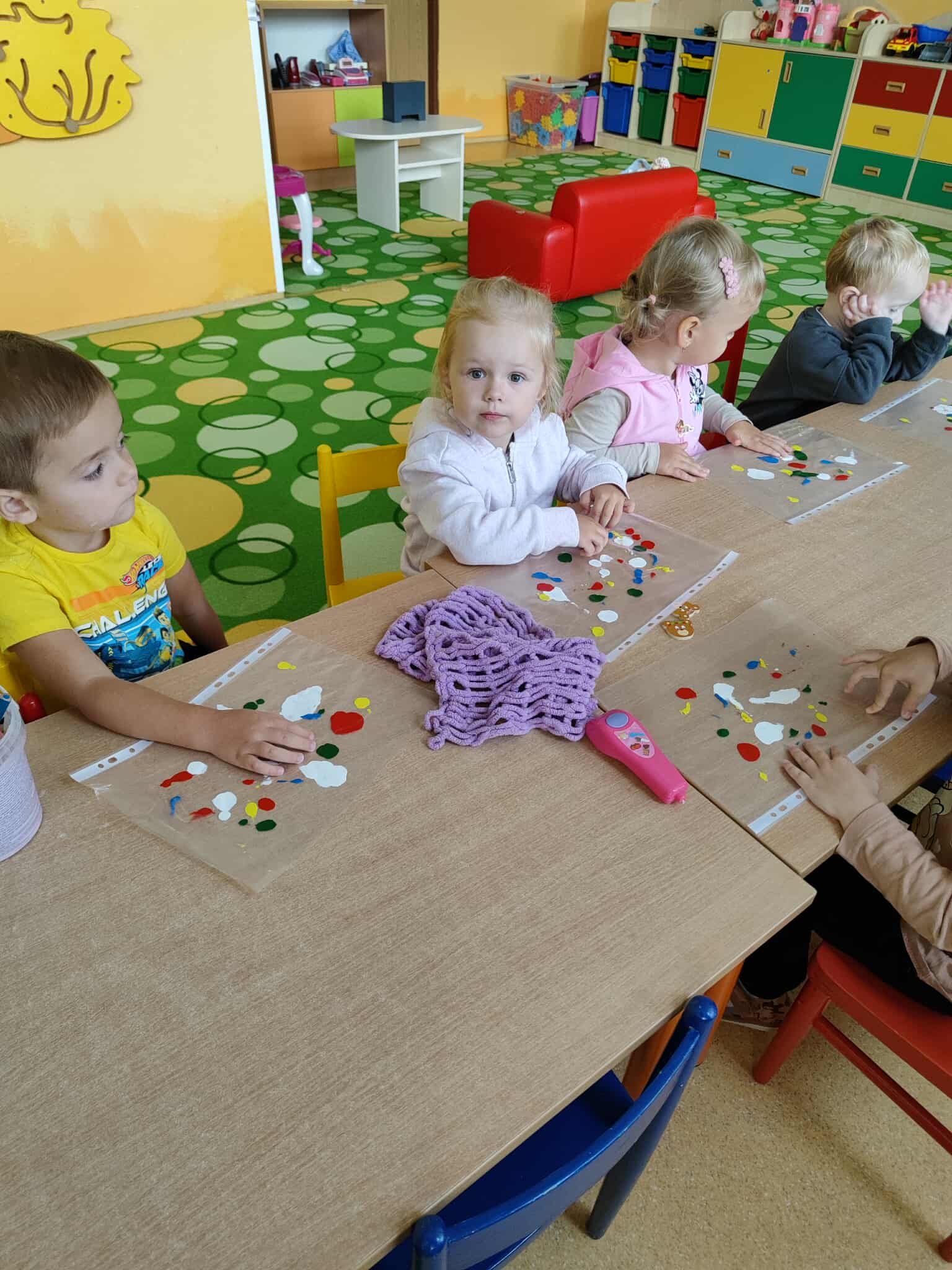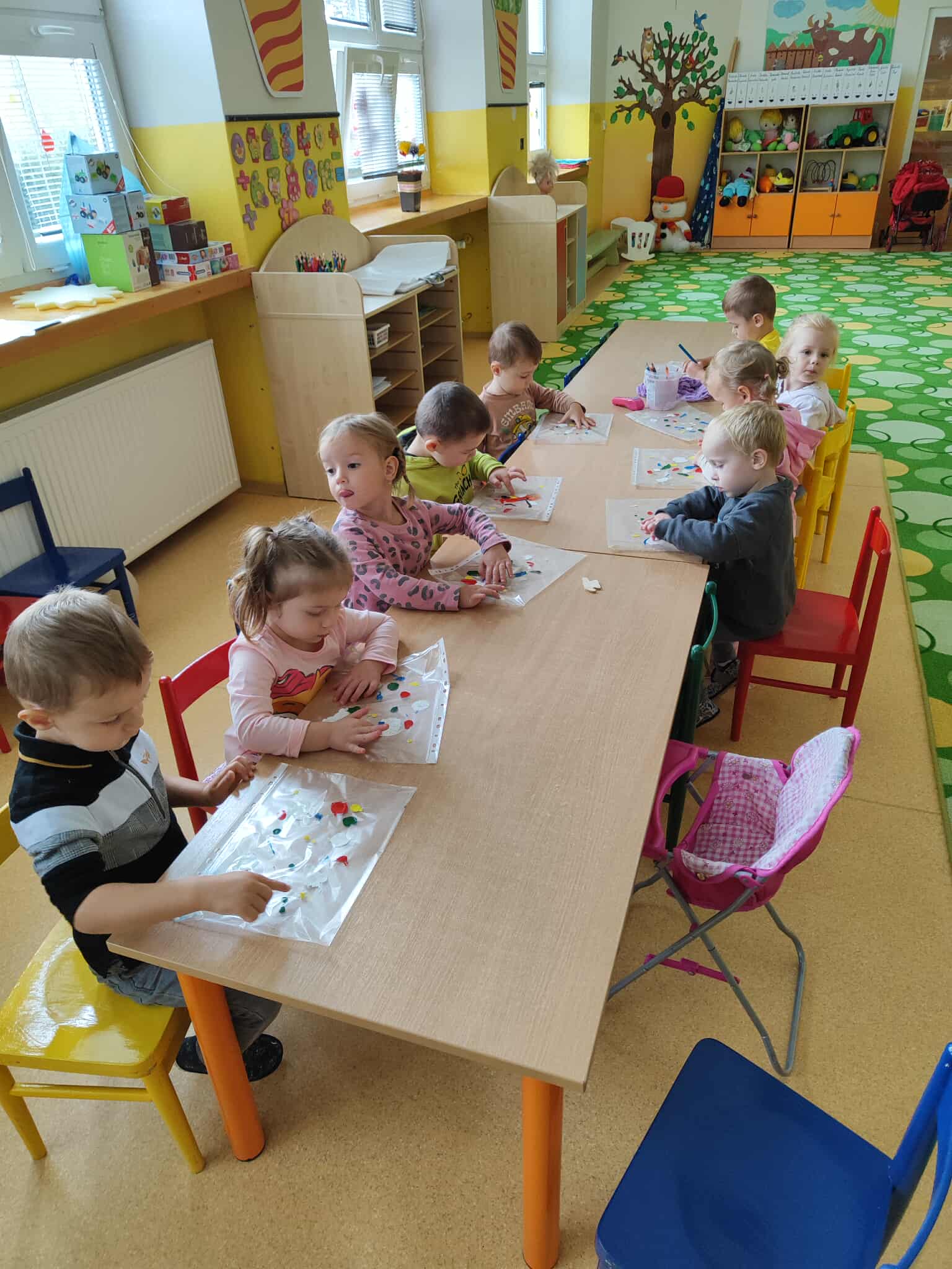 Najmenšie deti sa pustili do objavovania sveta farieb prostredníctvom zábavného pokusu – miešania farieb cez euroobal. Do priehľadného obalu naniesli farby, ktoré potom prstami jemne rozotierali a miešali. Pozorovali, ako sa farby spájajú a vytvárajú nové odtiene, čo v nich vzbudilo veľkú radosť a zvedavosť. Táto aktivita im pomohla rozvíjať zmyslové vnímanie, koordináciu pohybov a zároveň im priniesla množstvo tvorivej zábavy bez neporiadku.