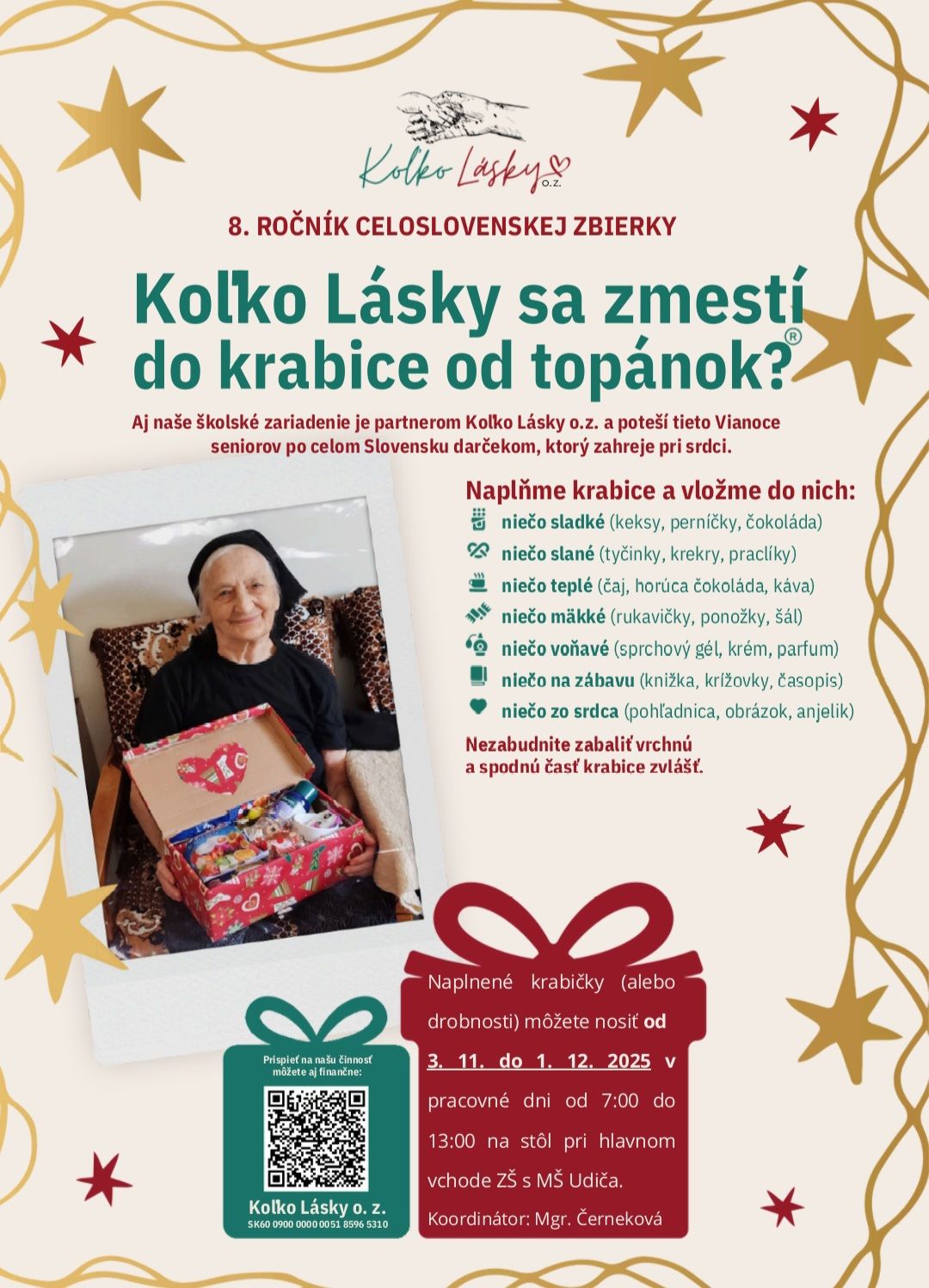 Aj tentoraz sme sa v predvianočnom období zapojili do krásneho celoslovenského projektu „Koľko lásky sa zmestí do krabice od topánok“, ktorý už tradične prináša úsmev a teplo do sŕdc našich seniorov. Žiaci, učitelia a rodičia z našej školy spoločne naplnili desiatky krabičiek rôznymi drobnosťami, sladkosťami, kozmetikou či milými pozornosťami, no najmä – veľkou dávkou lásky a úprimného priania radosti. Vďaka spoločnému úsiliu sa nám tento rok podarilo pripraviť 76 krabičiek pre starkých z Trenčianskeho kraja. Veľká vďaka patrí všetkým dobrým ľuďom z Udiče, ktorí sa do zbierky zapojili a prispeli svojou dobrosrdečnosťou. Sme radi, že sa nám podarilo túto krásnu tradíciu zachovať aj tento rok v našej Základnej škole s materskou školou, Udiča 248, a to už šiestykrát po sebe pod vedením pani učiteľky Mgr. Černekovej. Pani učiteľka spolu so svojimi šikovnými pomocníkmi z 5.A triedy všetky krabičky skontrolovala, starostlivo zabalila a s pomocou žiakov 6. ročníka naložila do auta a odovzdala na odberné miesto v SZŠ v Považskej Bystrici. Osobitné poďakovanie patrí aj pani vychovávateľkám a učiteľkám prvého stupňa, ktoré pre našich seniorov vyrábali nádherné vianočné pozdravy plné láskavých odkazov. Ďakujeme tiež všetkým triednym učiteľkám, ktoré na triednických hodinách so svojimi triedami s láskou pripravovali a balili krabičky, aby radosť putovala ďalej.