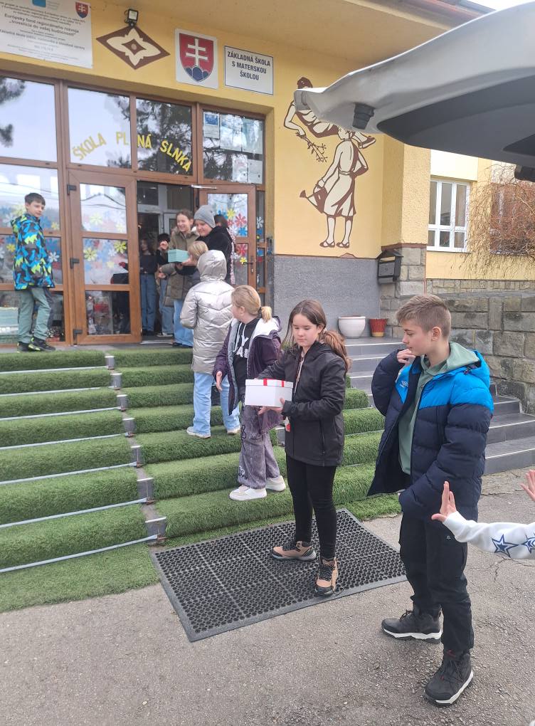 Koľko lásky sa vmestí do krabice od topánok? Určite veľa... Zistili sme to sami, keď sme sa pod vedením Mgr. P. Černekovej, zapojili aj v našej škole po prvýkrát do spomínanej akcie. Po celý čas (23.11. – 3.12.2020) jej usilovne pomáhali jej veľkí pomocníci zo 4.A triedy. Spoločne kontrolovali hotové krabice a z košíkov umiestnených vo vestibule školy balili nové zásielky, do ktorých pridávali množstvo maličkostí od každého, kto chcel prispieť do košíka. Podstatou akcie bolo naplniť krabicu drobnými darčekmi pre babičky a deduškov v domovoch dôchodcov. A veru sme boli milo prekvapení, aké úžasné množstvo „krabíc lásky" naši žiaci, učitelia, zamestnanci školy a rodičia pripravili. Bolo ich... 80!