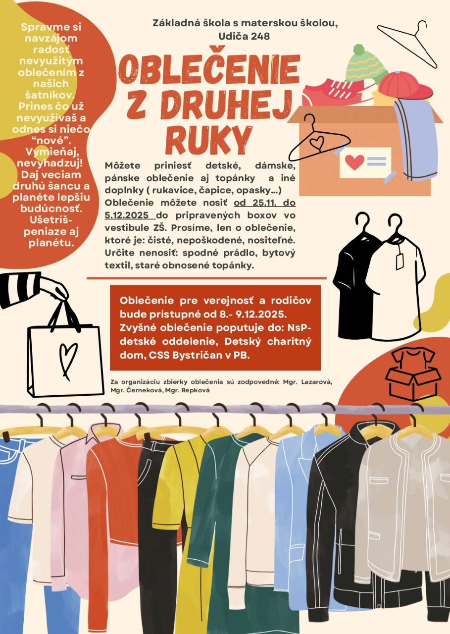 Za organizáciu zbierky oblečenia sú zodpovedné: Mgr. Lazarová, Mgr. Černeková a Mgr. Repková.